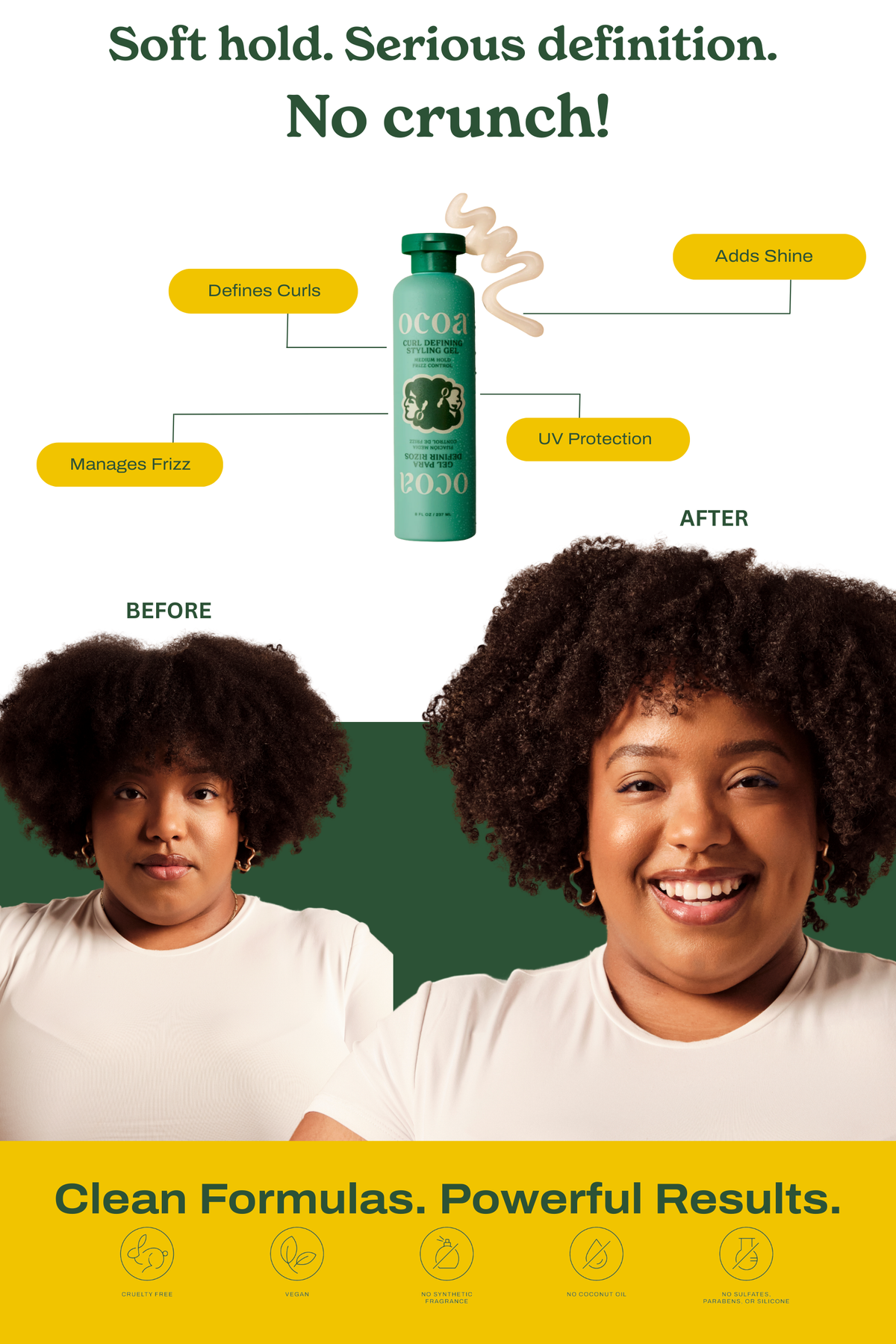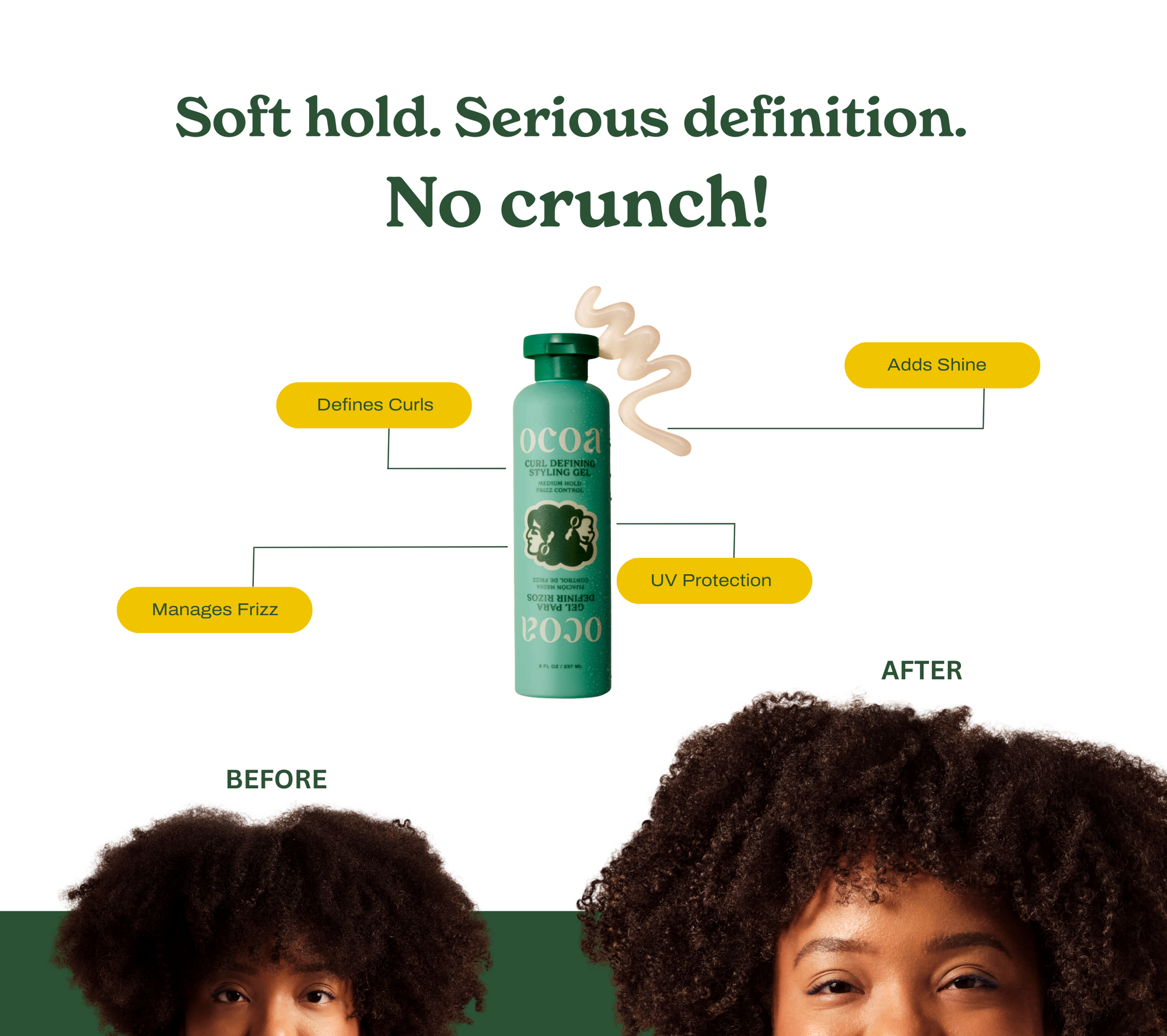 MODO DE USO: Seccione el cabello mojado y distribuya 1–2 cantidades del tamaño de una moneda. Desde las puntas hasta las raíces. Scrunch o define tus rizos con los dedos. Usar un difusor o secar al aire. Para mayor hidratación, combine con la Crema Hidratante Para Rizos Ocoa.