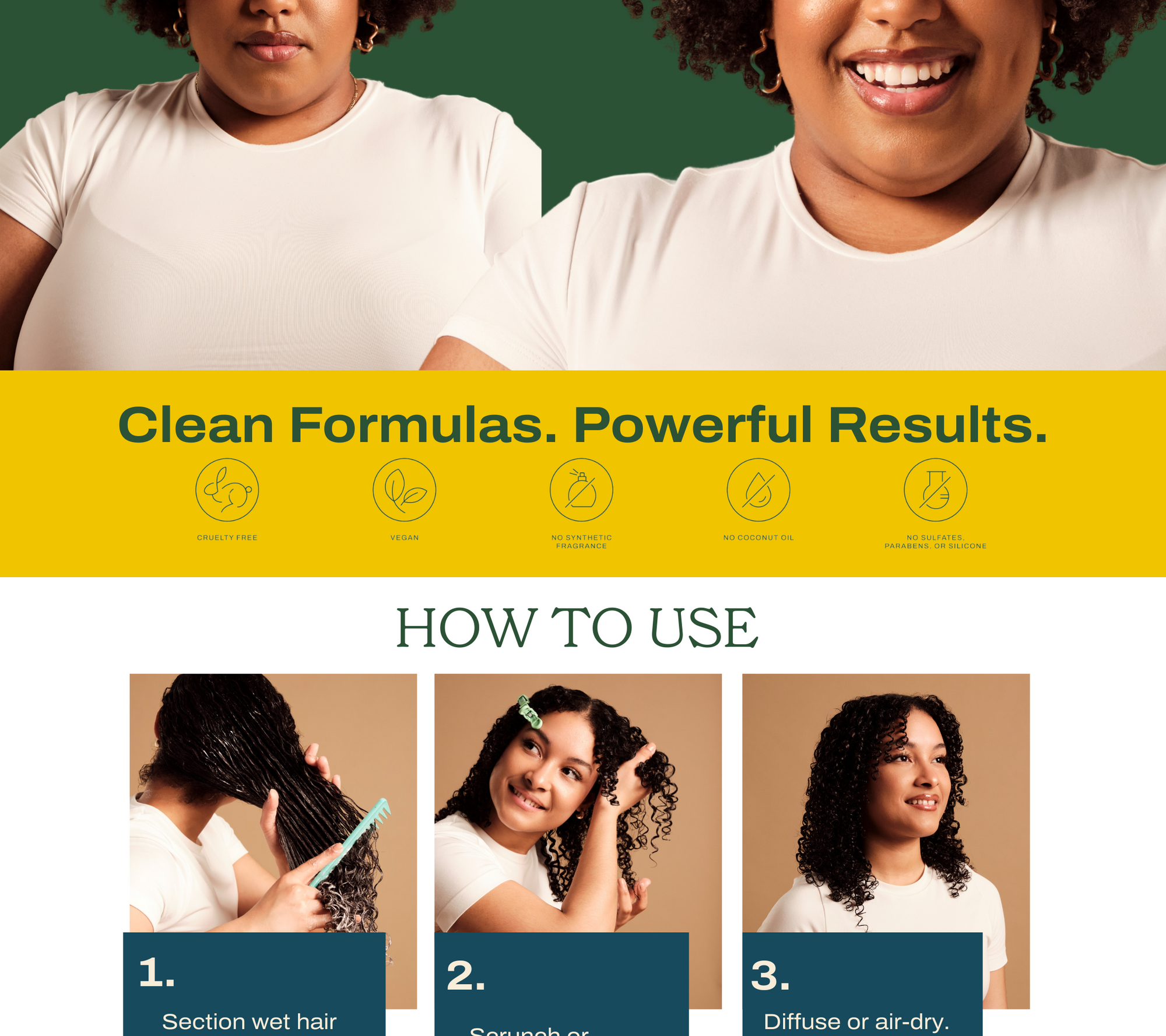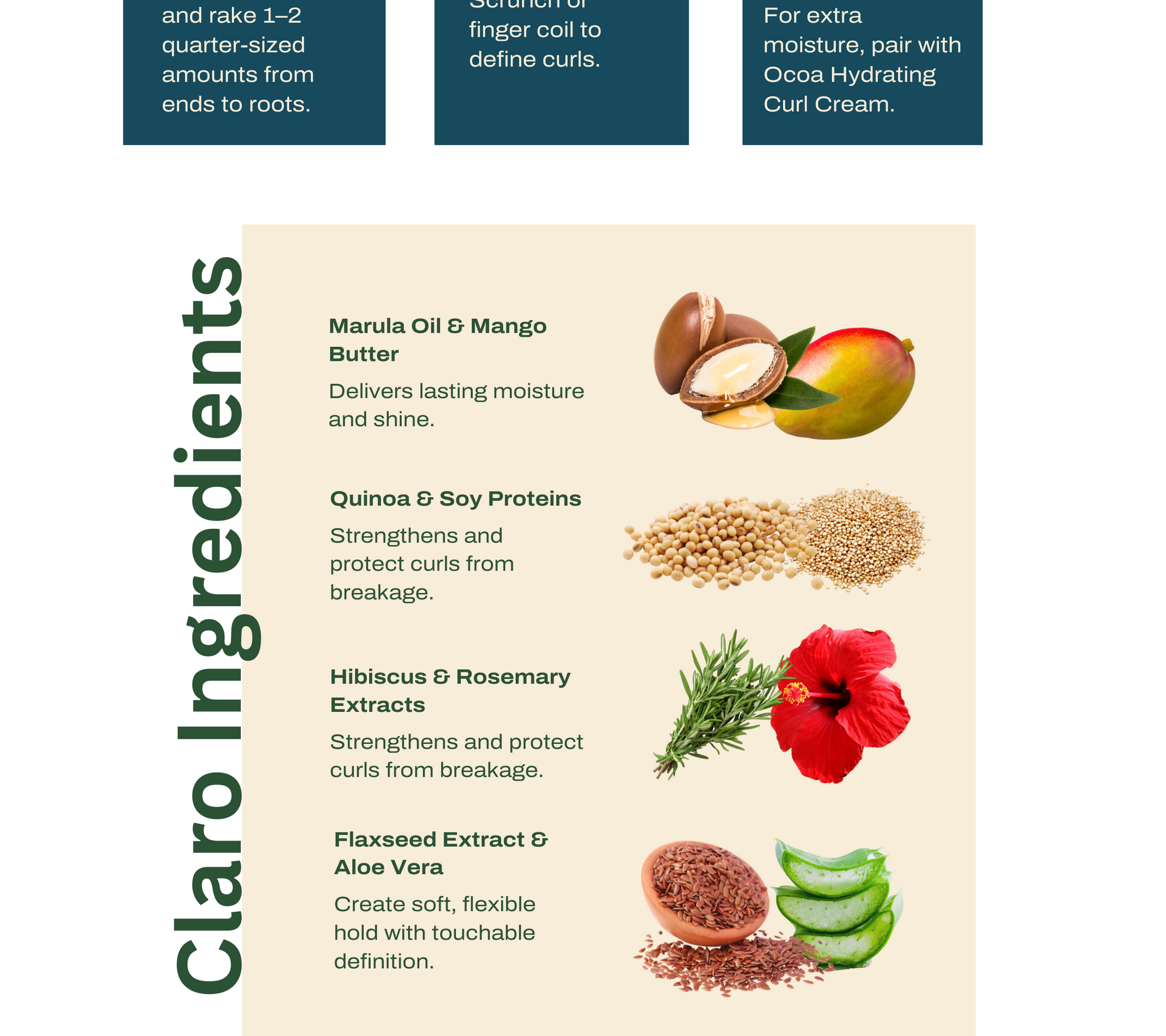 TO USE: Section wet hair and distribute 1–2 quarter sized amounts onto fingertips, raking from ends to roots. Scrunch or finger coil to encourage curl pattern. Diffuse or air dry. For extra moisture, pair with Ocoa Hydrating Curl Cream.