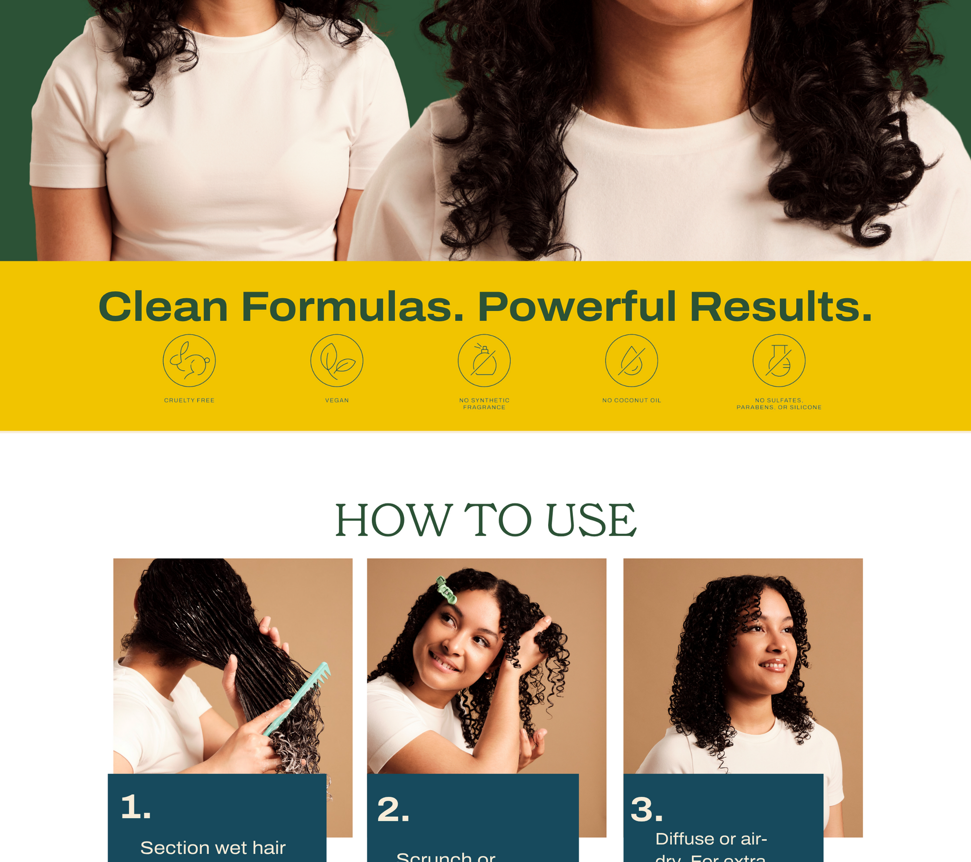 TO USE: Section wet hair and distribute 1–2 quarter sized amounts onto fingertips, raking from ends to roots. Scrunch or finger coil to encourage curl pattern. Follow with our Curl Defining Styling Gel for extra hold and shine. Diffuse or air dry. For blow drying straight, use half the amount and dry at less than 350 degrees.