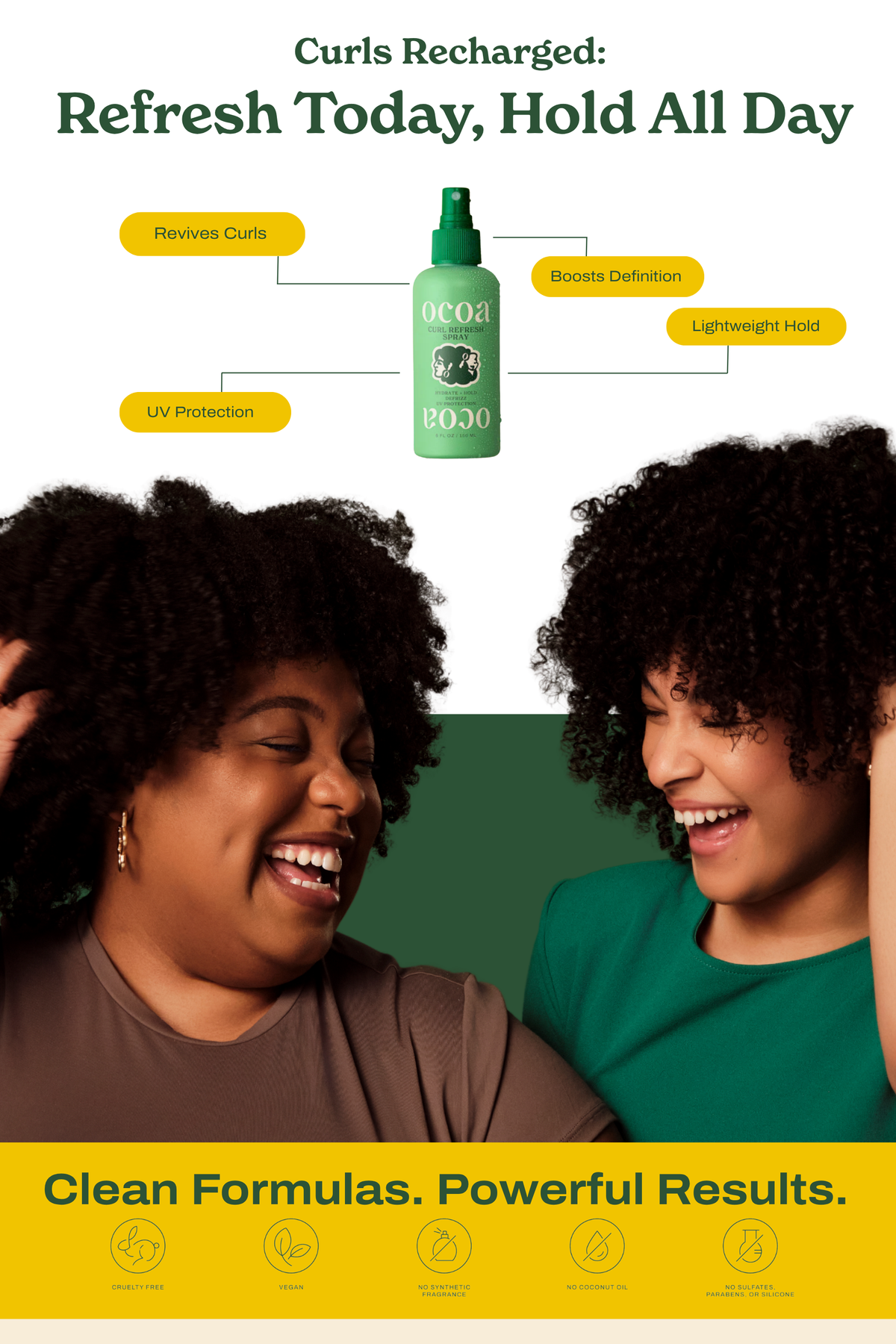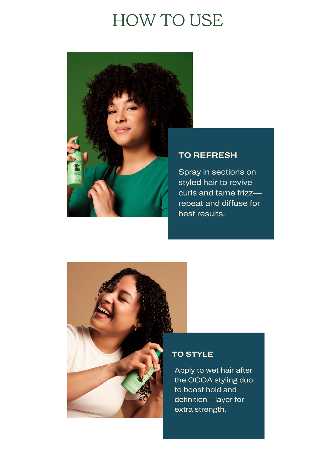 Our lightweight spray, packed with coffee seed extract, marula oil, and mango butter, extends your style, adds lasting hold, and revives curls—leaving wavy and curly hair soft, vibrant, and full of life, even if it’s dry, damaged, or color-treated.
