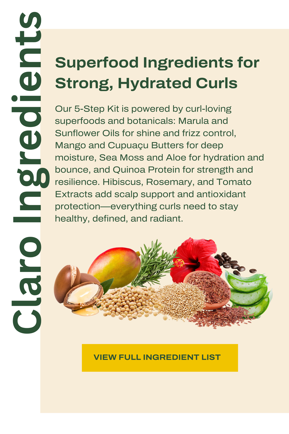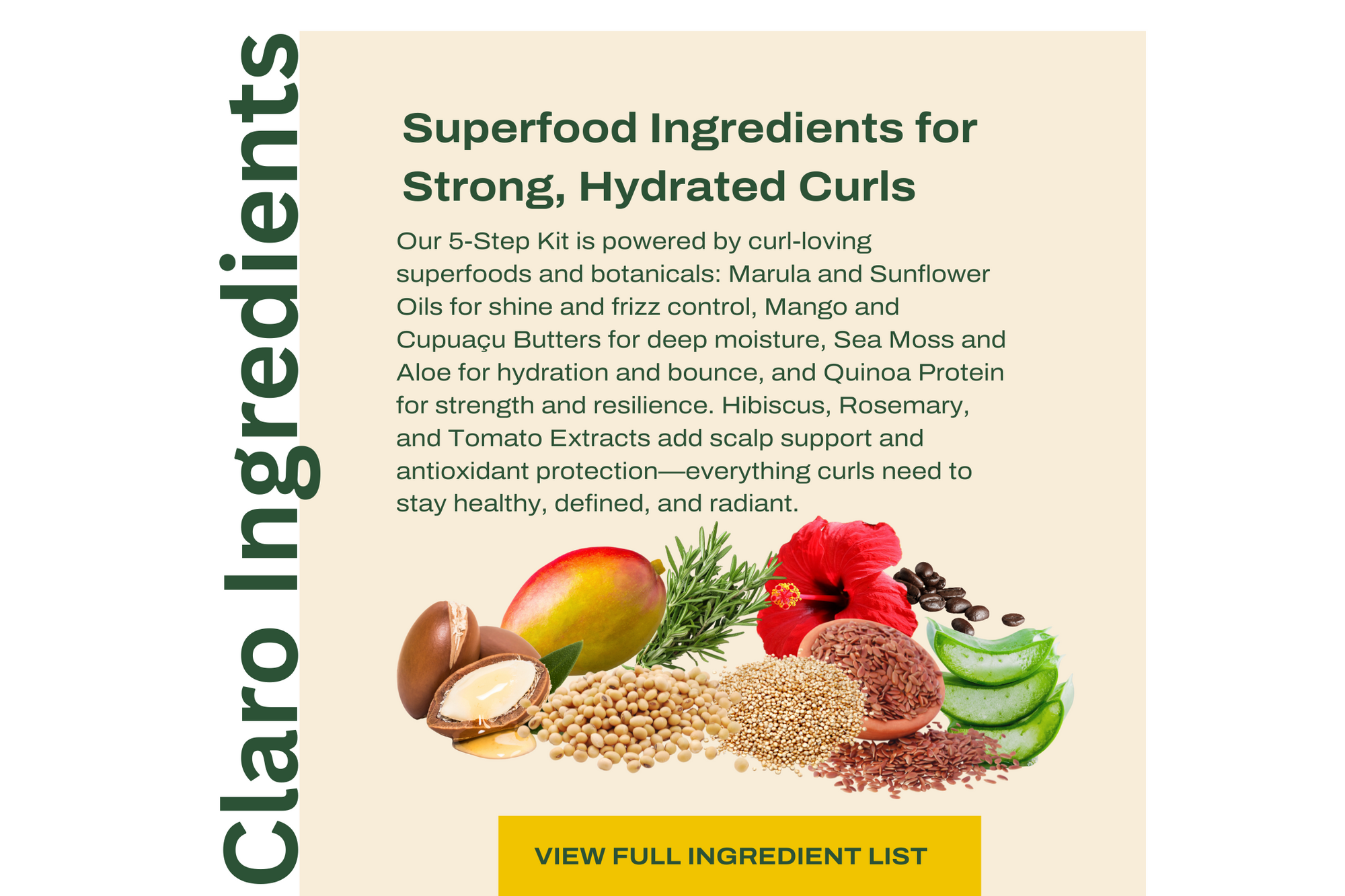 CREAM INGREDIENTS : Water (Aqua), Cetearyl Alcohol, Cetyl Alcohol, Helianthus Annuus (Sunflower) Seed Oil, Glycerin, Propanediol, Sclerocarya Birrea (Marula) Seed Oil, Mangifera Indica (Mango) Seed Butter, Fragrance (Parfum), Chenopodium Quinoa Seed Oil, Chenopodium Quinoa Seed Extract, Hibiscus Rosa-Sinensis Flower Extract, Rosmarinus Officinalis (Rosemary) Leaf Extract, Daucus Carota Sativa (Carrot) Root Extract, Oryza Sativa (Rice) Extract, Hydrolyzed Soy Protein, Glycine Max (Soybean) Seed Extract, Panax Ginseng Root Extract, Hydrolyzed Vegetable Protein, Urtica Dioica (Nettle) Extract, Butylene Glycol, Cetrimonium Chloride, Gluconolactone, Tetrasodium Glutamate Diacetate, Calcium Gluconate, Guar Hydroxypropyltrimonium Chloride, Sodium Benzoate.